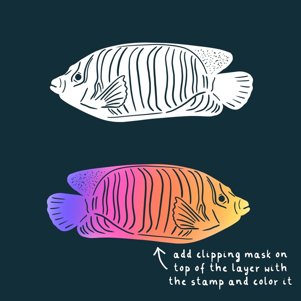 Stamp brushes are in 2 versions - with details and just filled inside, so you can pick what will go better with your drawing idea. Easy and fun to use!