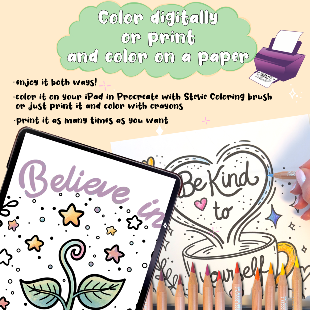 Unwind, relax, and spark your creativity with Good Vibes & Positivity - my first hand-drawn Procreate tracing and coloring workbook designed to bring you stress relief, inspiration, and joy! Each page features uplifting and motivating quote to boost your mood while you create.