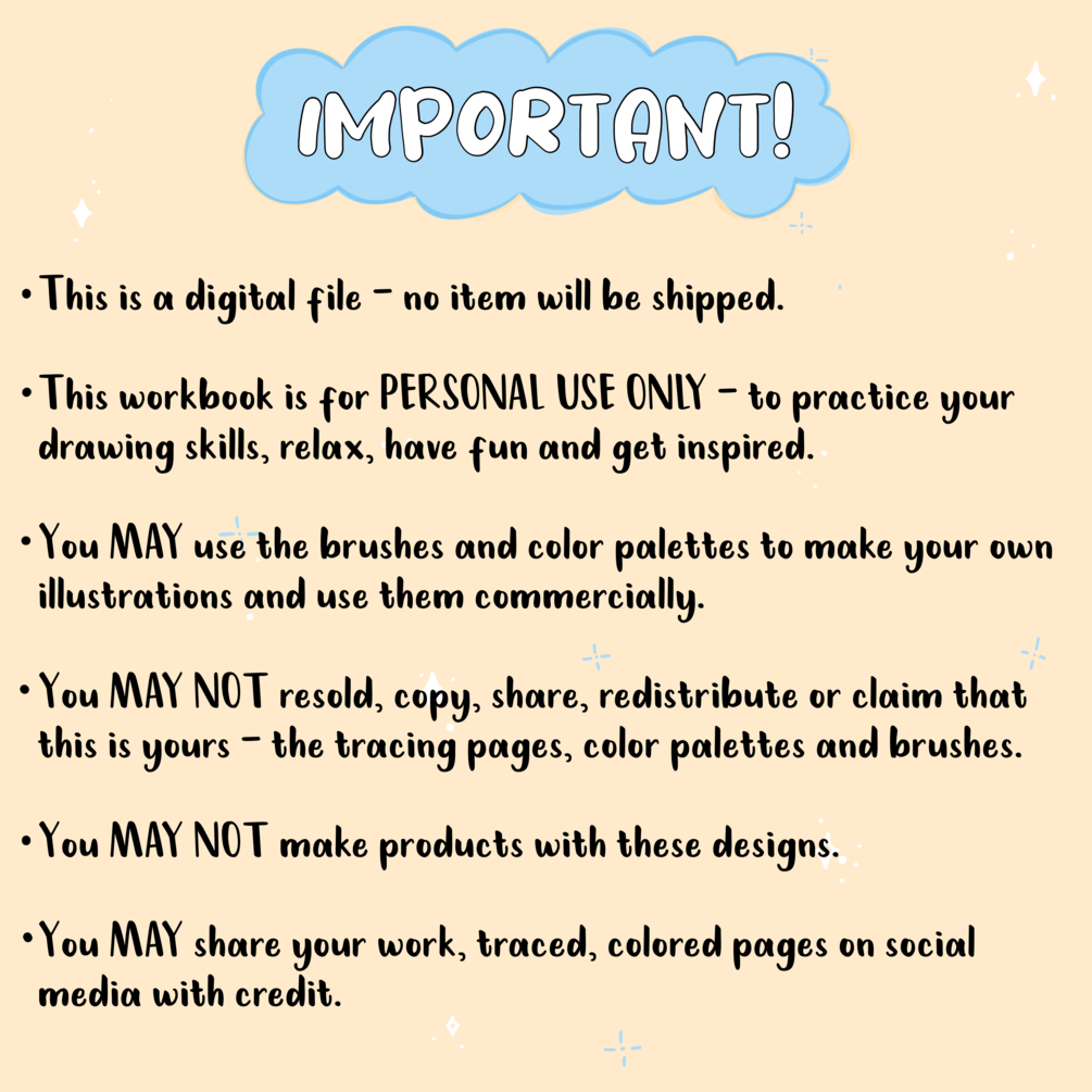 - you MAY NOT resale, copy, share , redistribute or claim that this is yours - the tracing pages, color palettes or brushes
