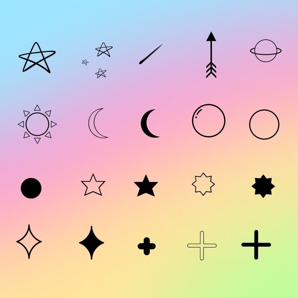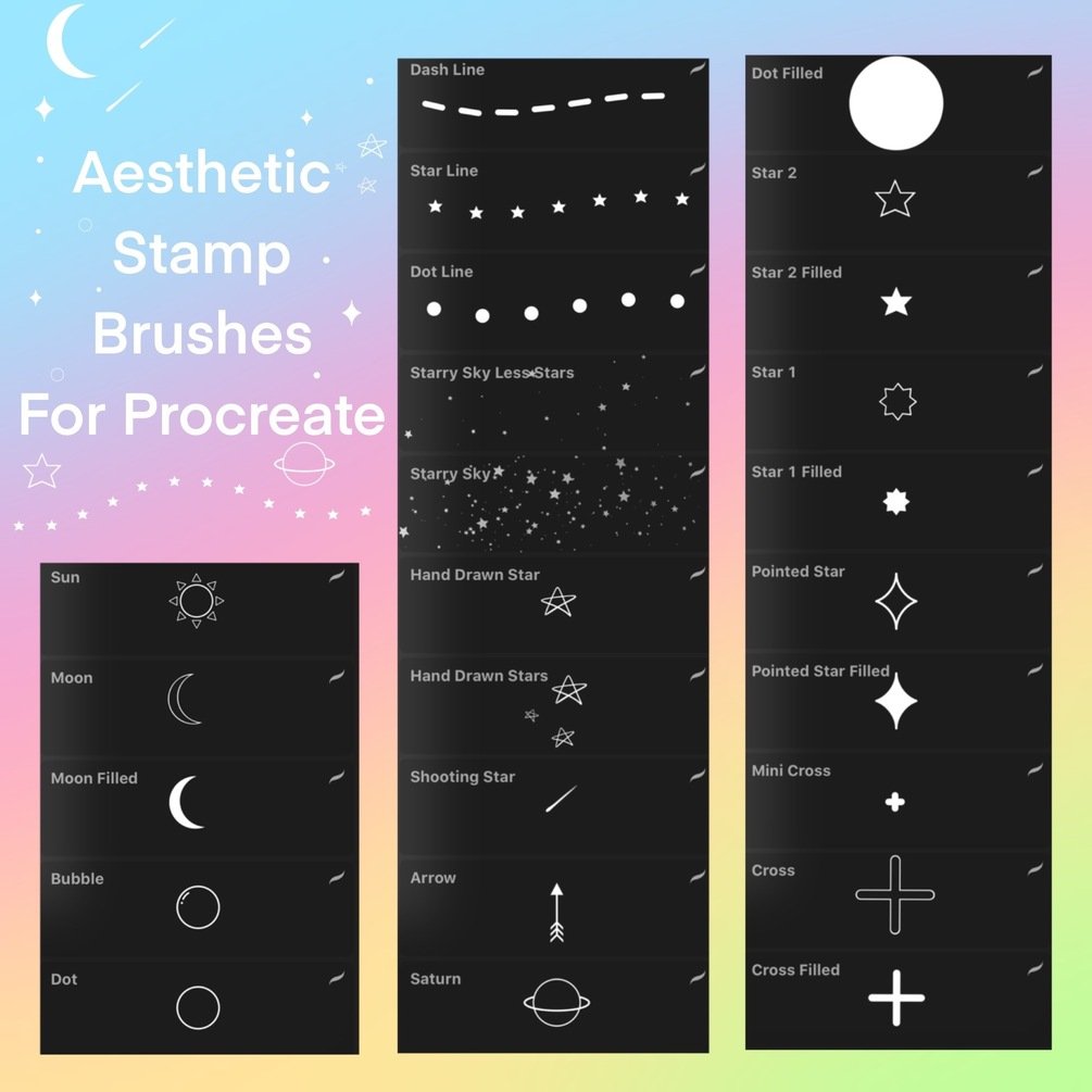 Aesthetic Stamp Brushes for Procreate - set of 20 stamp brushes with 2 starry sky brushes, dotted line, dashed line and stars line, to help you create beautiful cute and aesthetic illustrations.